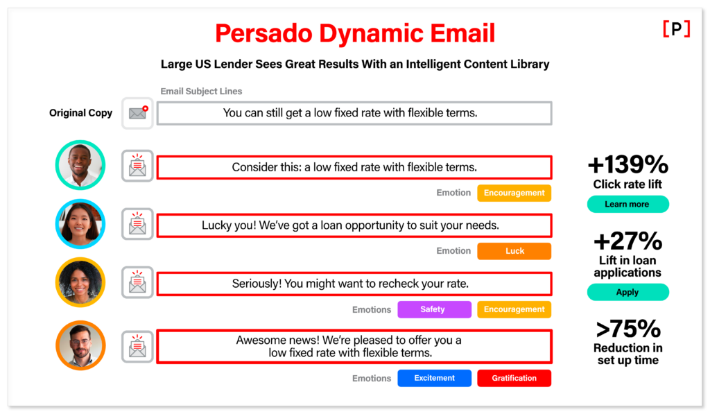 Dynamic Email is already driving results for finserv companies. For example, a large U.S. lender used their Persado content library of approved message variants for a mortgage email campaign—reducing setup time by 75%, and driving nearly 140% click lift and more than 25% lift in loan applications.